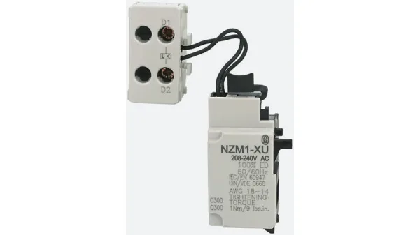 Relé de mínima tensión con abrazaderas laterales – Bobina de bajo voltaje 208 240V AC NZM1-XU208-… – Eaton – 259442 – 4015082594428: Tensión de alimentación de mando nominal Us con CC 0 V, Tipo de tensión para el accionamiento CA.